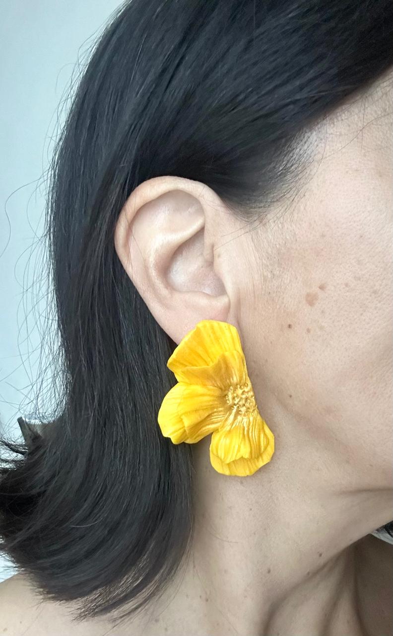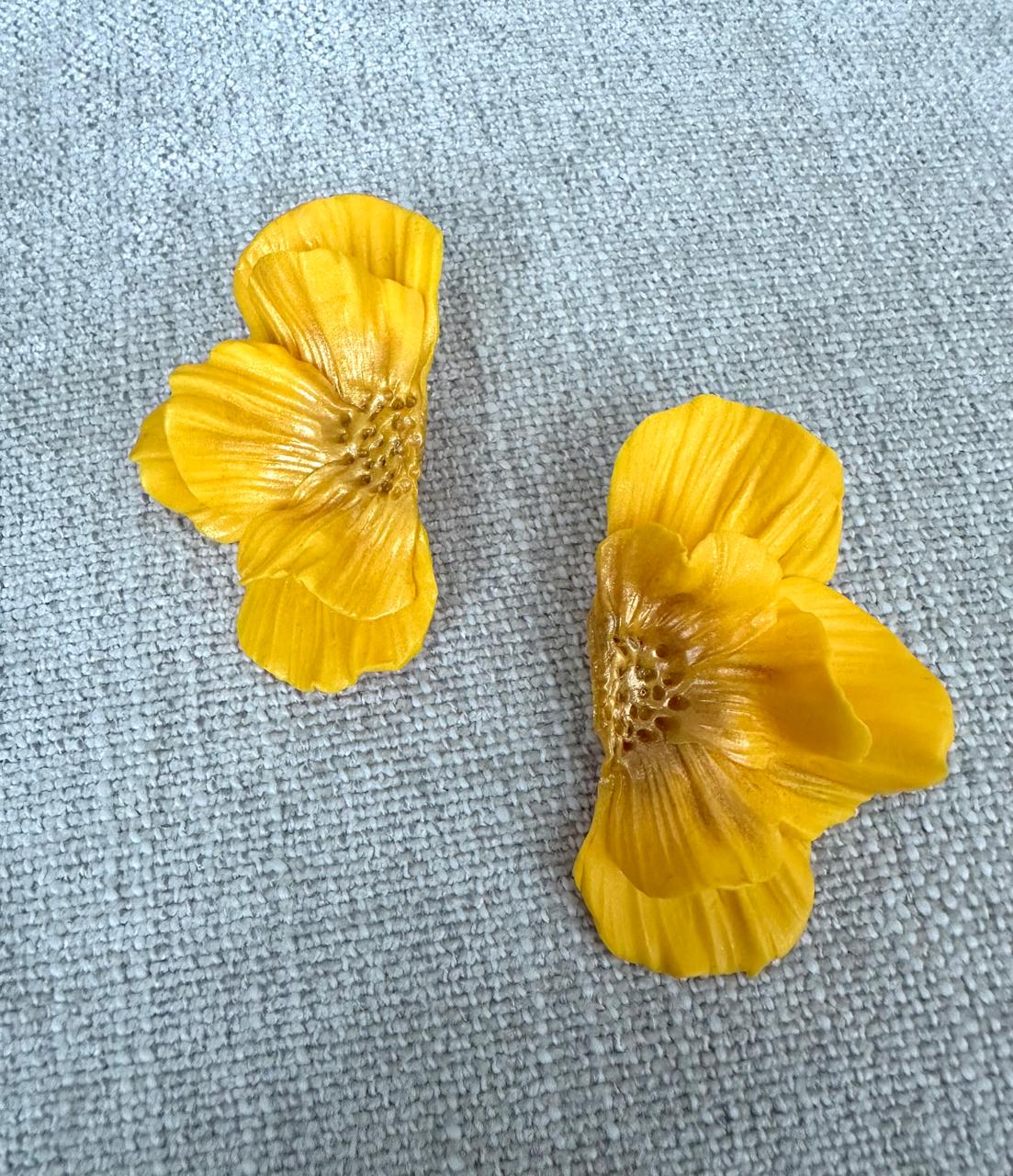 Aros hechos a mano , asemejando una media flor. De color amarillo y un toque más oscuro en su centro.