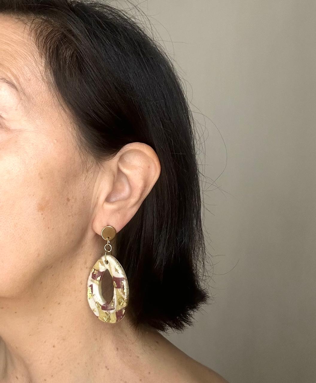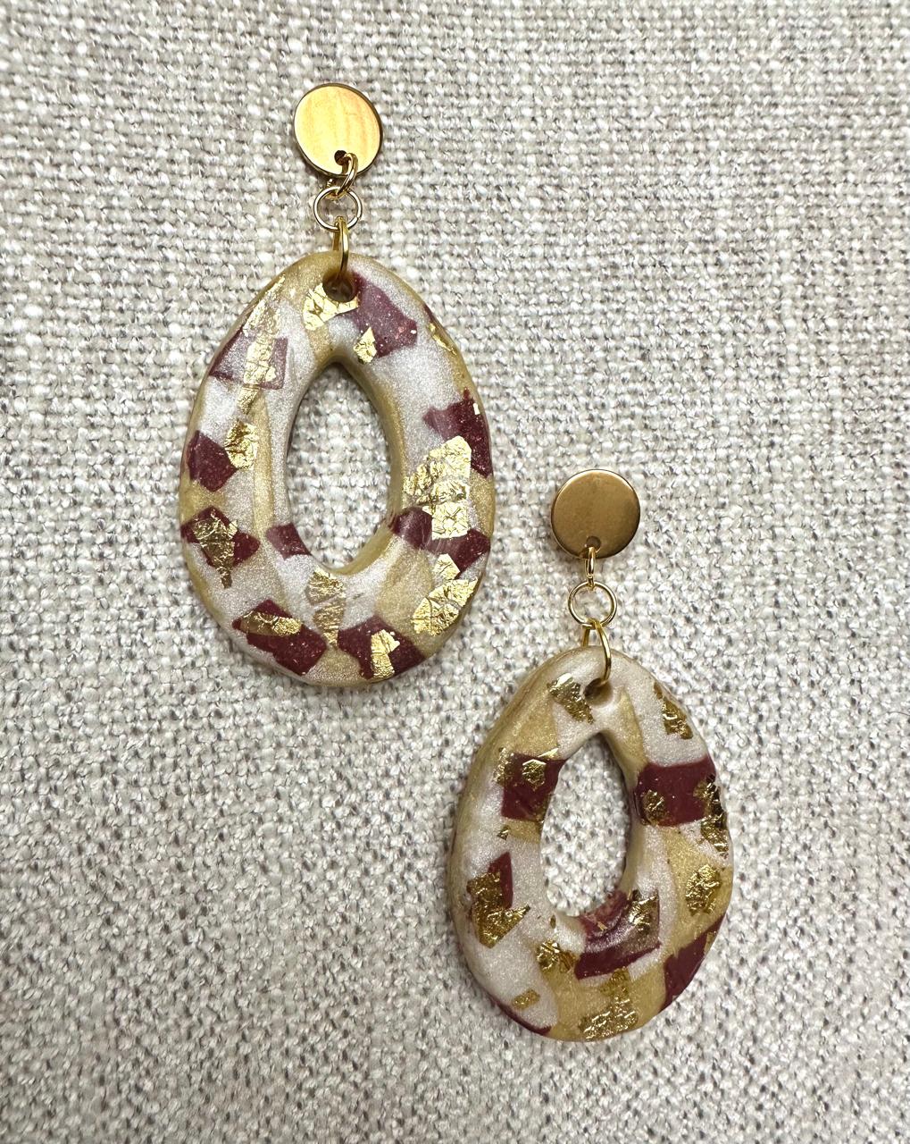 Aros hechos a mano, utilizando colores arena con toques de burdeo y dorado.