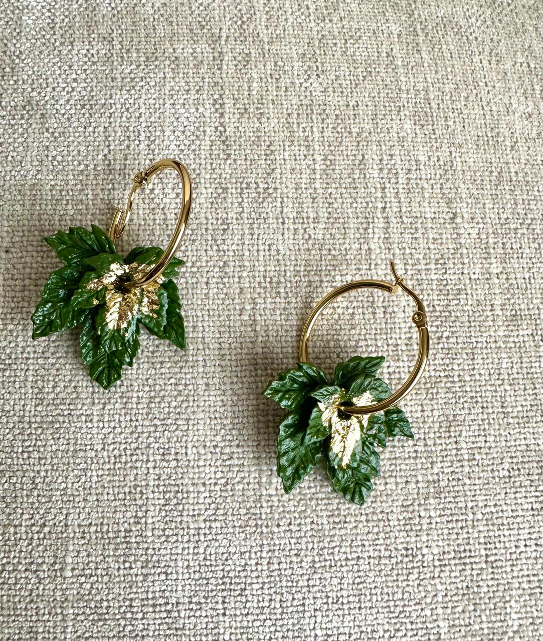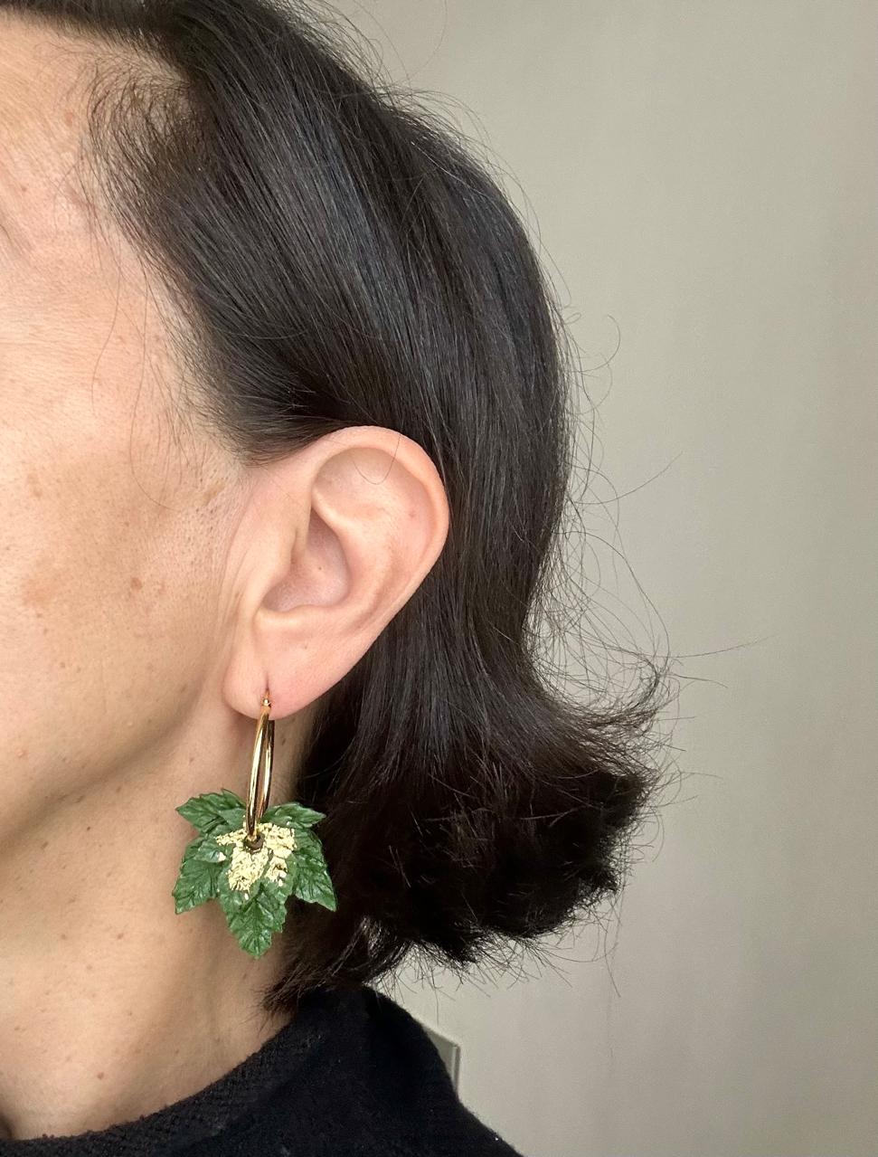 Aros hechos a mano, compuestos por 2 hojas en cada aro, y un toque de pátina dorada, dándole una luz en el centro.